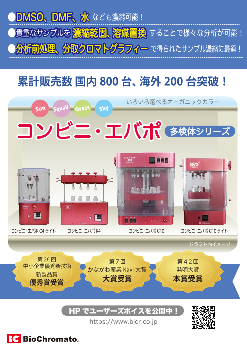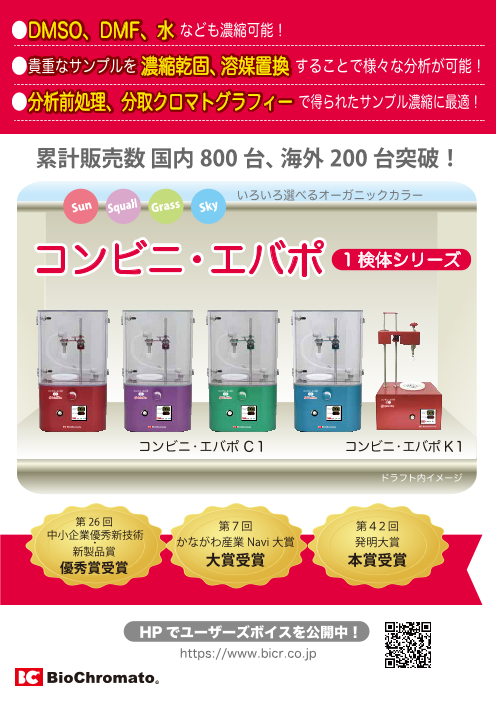 気軽に使えて簡単便利な新しいタイプの濃縮装置です。研究空間を心地よく彩ります。■突沸リスク、ゼロ■DMSO、DMF、NMP、水などを効率的に濃縮■サンプルロス、洗浄時間...