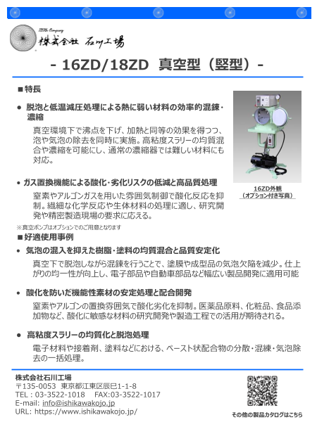【特長】・石川式撹拌擂潰機の特徴そのままに、真空(減圧)環境下で処理が可能 ・16ZD号の処理容積:0.4L。 18ZD号の処理容積:1.0L。・真空(減圧)環境下で処理がで...