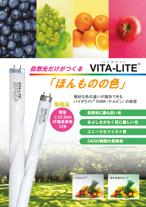 バイタライト®は中近紫外線から可視光線にかけて、CIE(国際照明委員会)が標準化した平均正午の太陽光(色温度:5500K,CIE昼光)の分光分布に非常に近似するよう設計されていま...