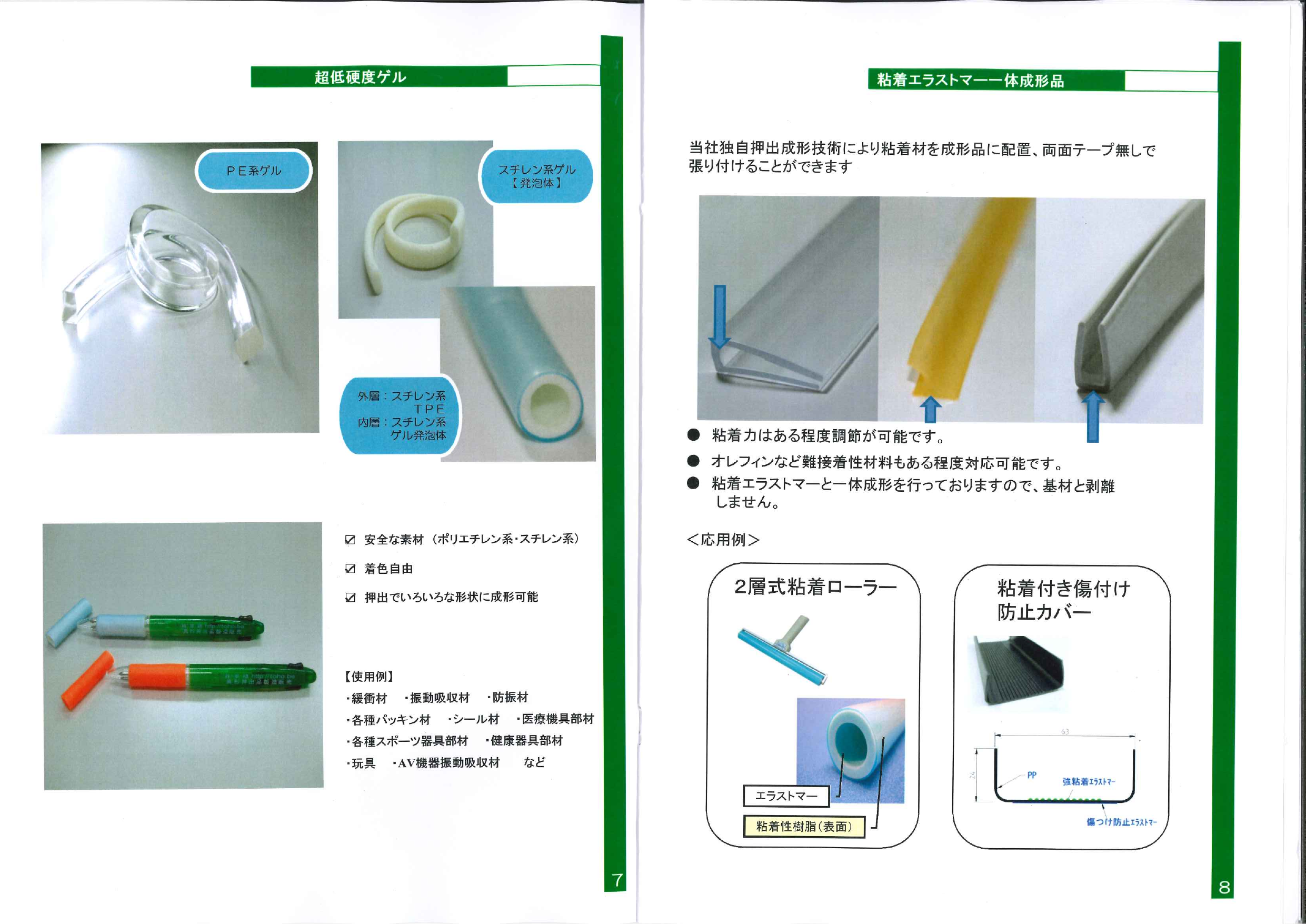 超低硬度ゲル ・安全な素材(ポリエチレン系・スチレン系) ・着色自由 ・押出で色々な形状に成形可能粘着エラストマー一体成形品 ・粘着力はある程度調節が可能...