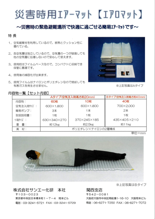 災害時の緊急避難場所で快適に過ごせる簡易エアーマットです。