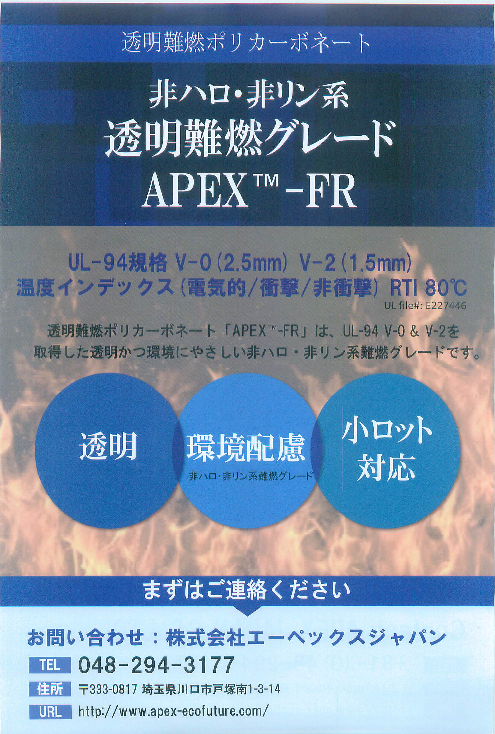 透明難燃ポリカーボネート「APEX-FR」は、UL-94 V-0 & V-2を取得した透明かつ、環境ににやさしい非ハロ・非リン系難燃グレードです。・透明・環境配慮・小ロット対応...