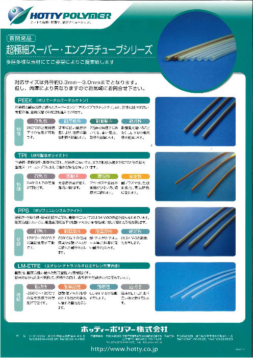 PEEK、TPIを初め多種多様な素材にて対応いたします。対応サイズは外径約0.3㎜~3.0㎜までとなります。ただし肉厚により異なりますのでお気軽にお問合せください。