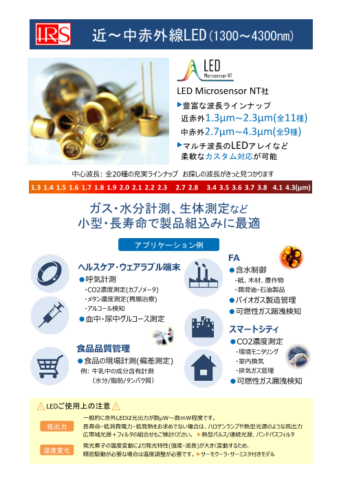 LED Microsensor NT社製の近赤外・中赤外LEDをご紹介いたします。取扱波長1.0~4.3µm(1000nm~4300nm)充実のラインナップ、中赤外ハイパワーLEDをはじめとした独自技術を用...