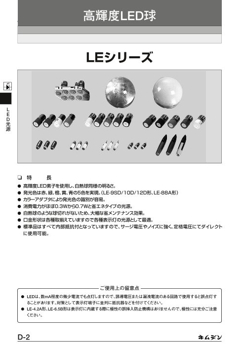 ◆発光色は赤、緑、橙、黄、青の5色を実現。(LE-9SD/10D/12D形、LE-88A形)◆カラーアダプタにより発光色の識別が容易。◆消費電力がほぼ0.3Wから0.7Wと省エネタイプの光源。...