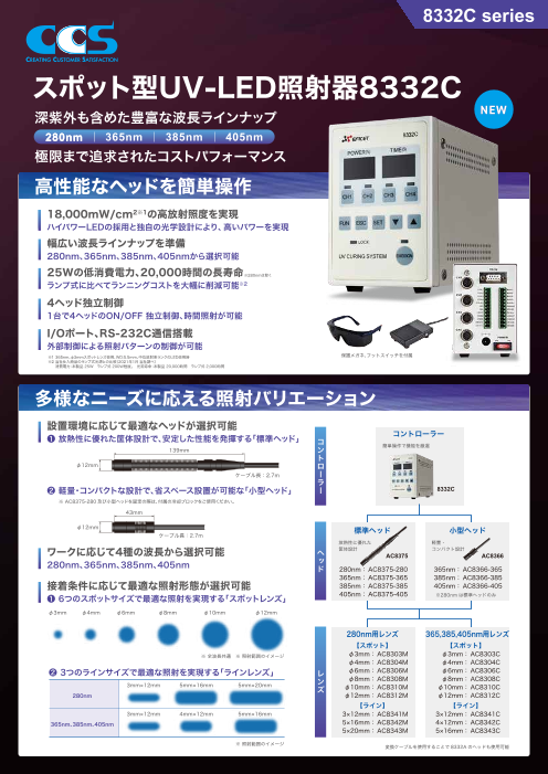 ・5種類の放射面サイズ×4波長(365/385/395/405nm)をラインアップ・独自の光学設計で高い均一度を実現・広範囲を効率的に照射可能◆詳細はカタログをダウンロードしご覧い...