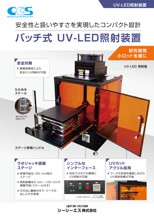 シーシーエスはUV-LEDを使用したUV硬化システムをご提案いたします。UV-LED照射器だけでなく、UV照射装置までお客様のご要望に応じたUV硬化システムをご提案します。●UV硬...