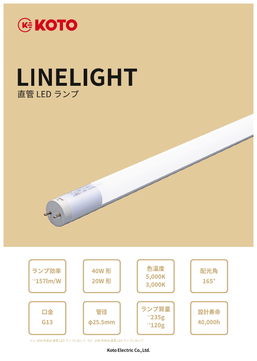 ・ランプ効率:1157 lm/w・40W形 / 20W形・色温度:5000K / 3000K・配光角:165°・口金:G13・管径:Φ25.5mm・ランプ質量:235g / 120g・設計寿命:40,000h【...