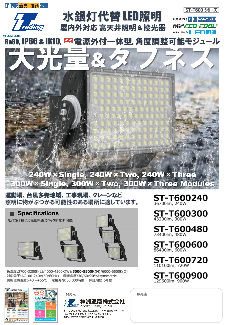 LUMILEDS製LED、MEAN WELL製電源採用。定格寿命:50000時間製品保証:5年間■ST-T600シリーズST-T600240ST-T600300ST-T600480ST-T600600ST-T600720ST-T600900...