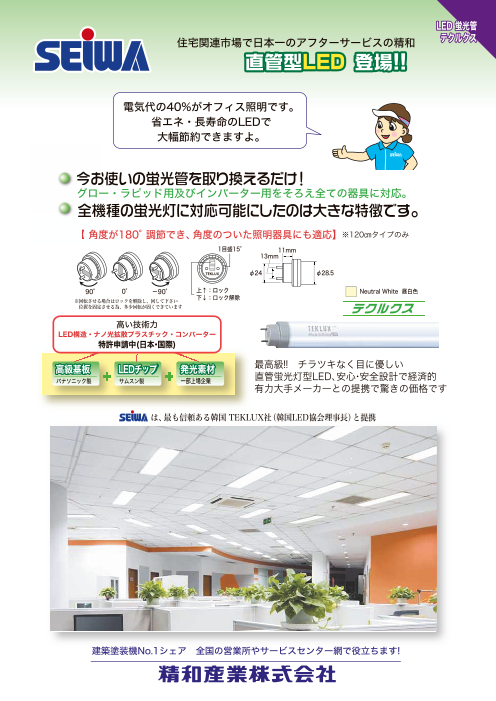 テクルクス LED蛍光管・電気代の40%がオフィス照明・省エネ、長寿命のLEDで大幅節約・最高級!ちらつきなく、目にやさしい・有力大手メーカーとの提携で安心、安全、...