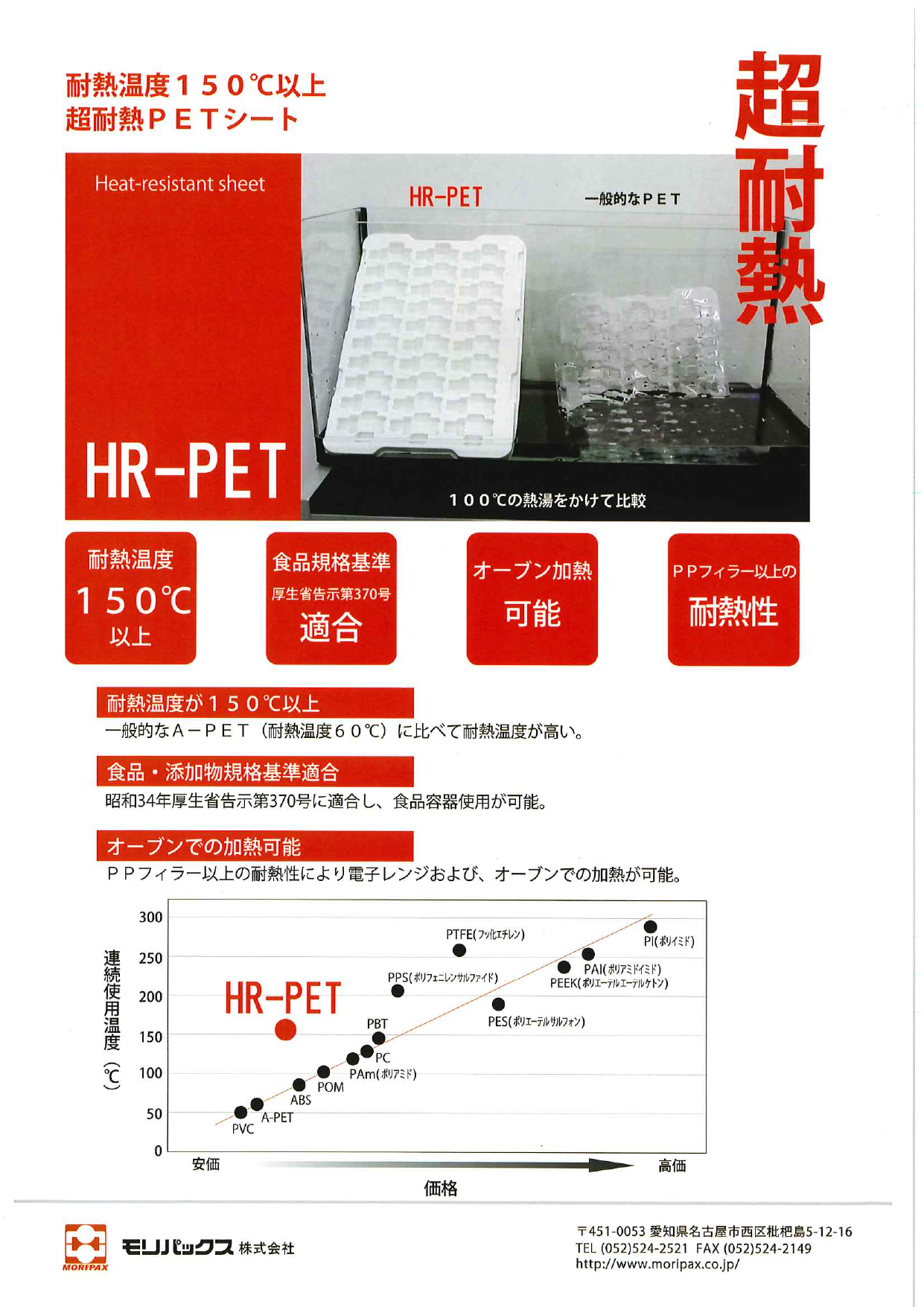 ・耐熱温度が150℃以上 一般的なA-PET(耐熱温度60℃)に比べて耐熱温度が高い・食品・添加物規格基準適合 昭和34年厚生省告示第370号に適合し、食品容器使用が可能...