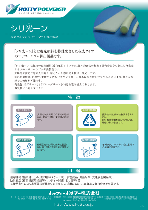 『シリ光ーン』は、蓄光顔料を特殊配合した夜光タイプのシリコーンゴム押出製品です。従来の夜光顔料(硫化亜鉛タイプ等)に比べ約10倍の輝度と発光時間を可能にしまし...