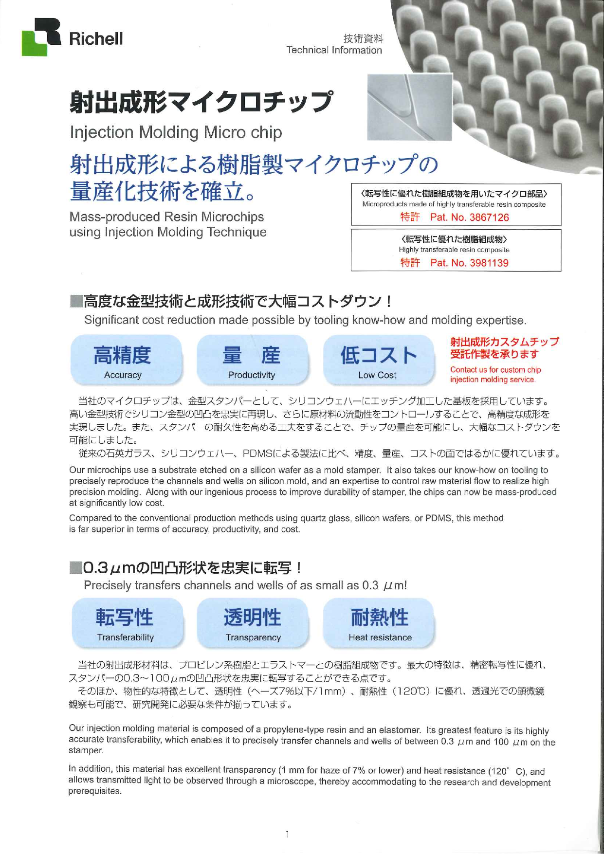 当社のマイクロチップは、金型スタンバーとして、シリコンウェハーにエッチング加工した基板を採用しています。高い金型技術でシリコン金型の凹凸を忠実に再現し、されに原材料...