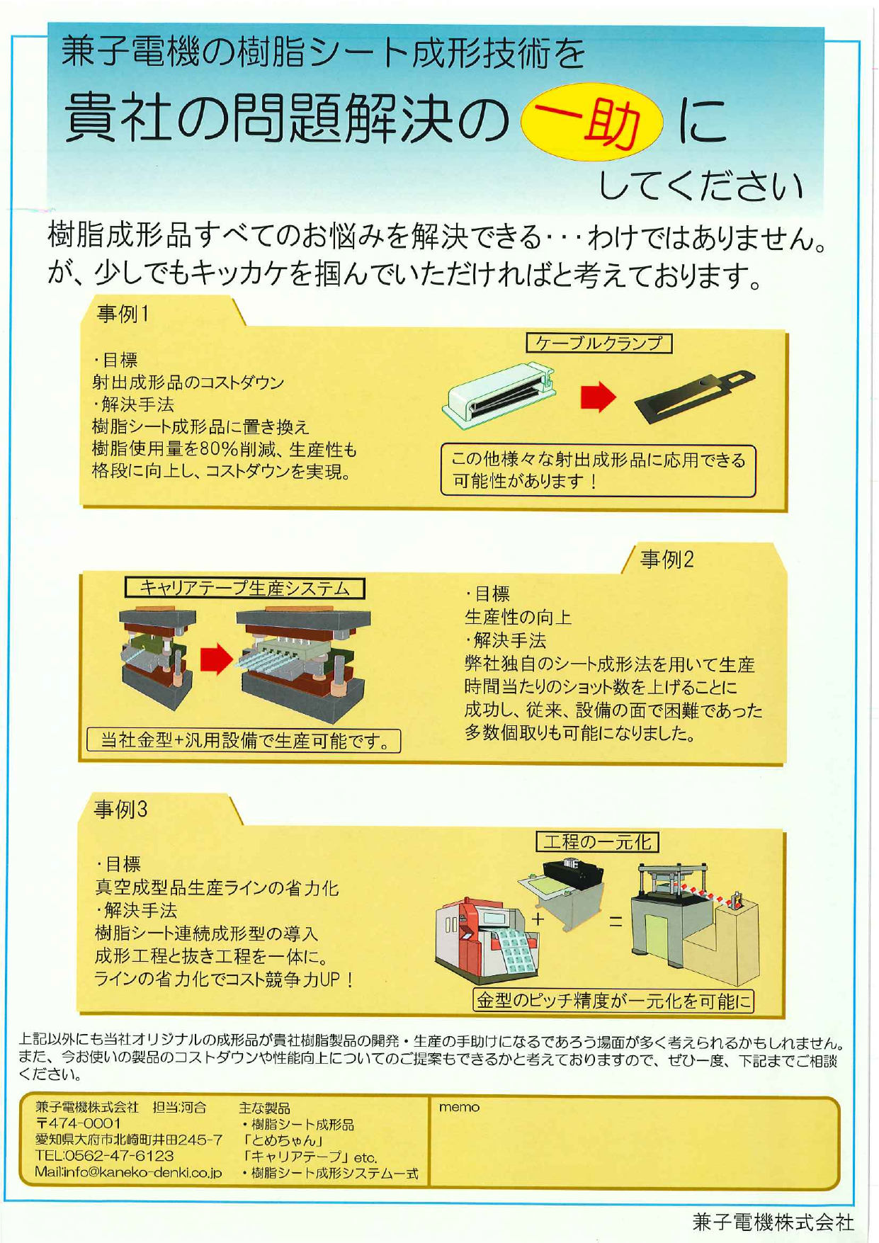 兼子電機の樹脂シート成形技術を貴社の問題解決の一助にしてください