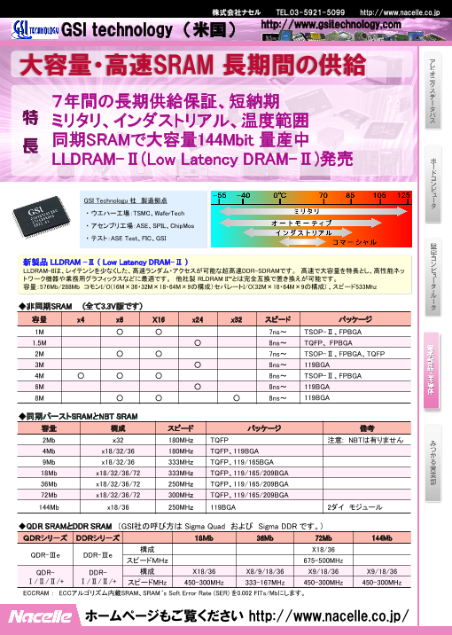 ●ミリタリ、インダストリアル、温度範囲●同期SRAMで大容量144Mbit量産中●LLDRAM-II(Low Latency DRAM-II)発売 LLDRAM-IIは、レイテンシを少なくした、高速ランダム・ア...