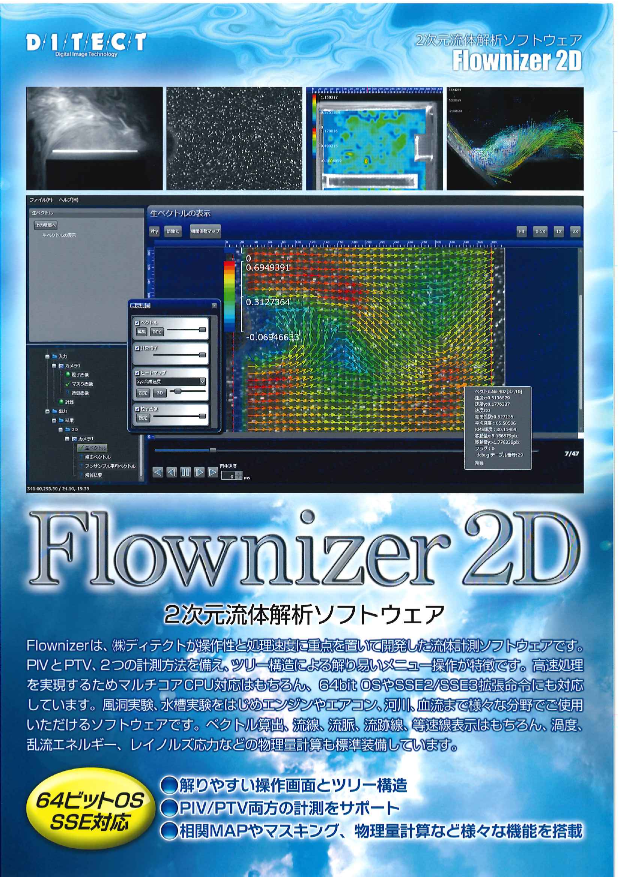 Flownizerは、(株)ディテクトが操作性と処理速度に重点を置いて開発した流体計測ソフトウェアです。PIVとPTV、2つの計測方法を備え、ツリー構造による解り易いメニュー操...