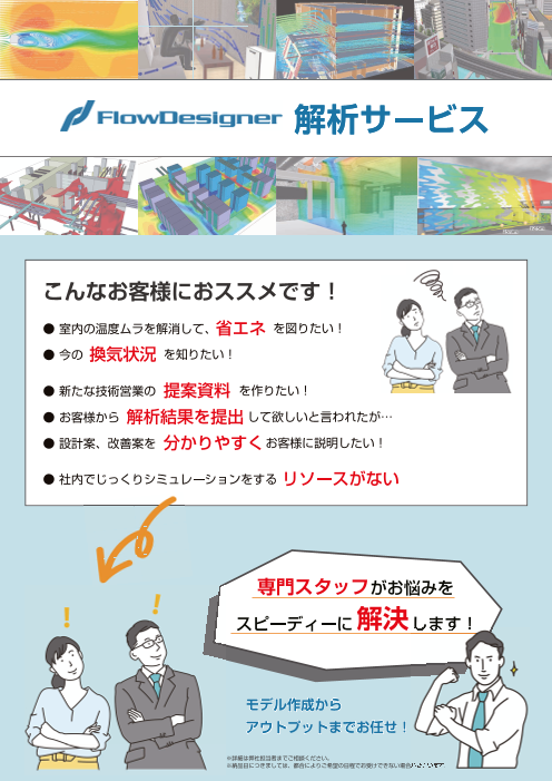 弊社ソフト「FlowDesigner」を使用した、気流/温熱/環境解析サービスを有償にて行っております。目に見えない空気の流れ、空間の温度分布・汚染度分布などをコンピュータシミュレーションにより解析します。