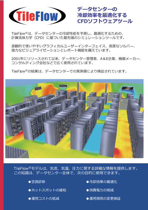 TileFlowは、データセンター専用の熱気流解析ソフトウェアです。開発者S.V.Patankarの先進的なアルゴリズム(Exponential Method)で年々増大する省電力化の要求に的確に対応し...