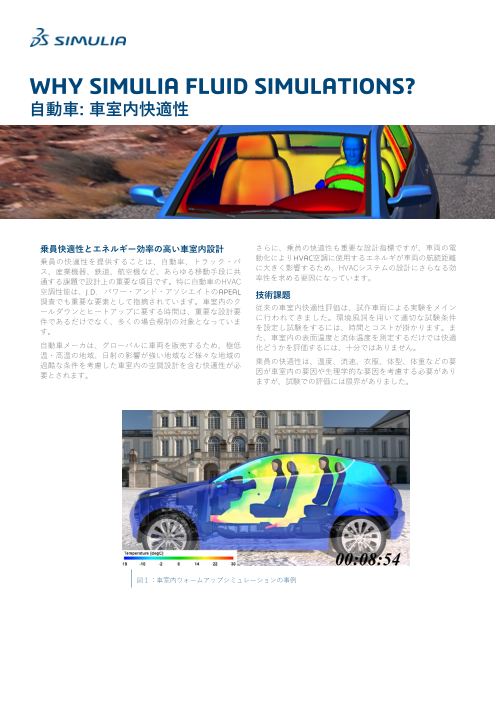 乗員の快適性は、自動車、トラック・バス、産業機器、鉄道、航空機など、あらゆる移動手段に共通する課題で設計上の重要な項目です。 特に自動車のHVAC空調性能は、J.D. パワー...