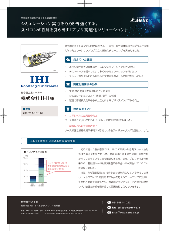 航空用ジェットエンジン開発における、三次元圧縮性流体解析プログラムと流体力学シミュレーションプログラムの高速化チューニングを実施しました。◆抱えてい...