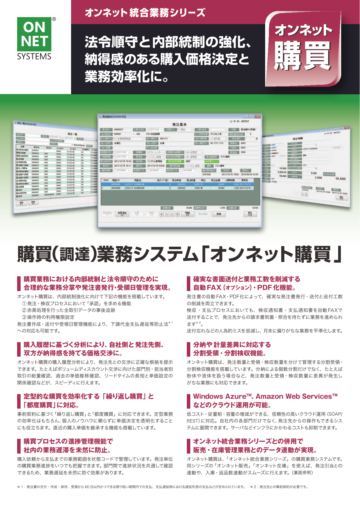 「オンネット購買」は、図の機能を一通り網羅しており、大変高機能です。当社は、起業後14年(2014年現在)に亘り、上場企業(化学)の原材料購買システムを開発、運用してきた経緯、実績があります。その実績を元に「オンネット統合業務」内に購買機能として統合実装...