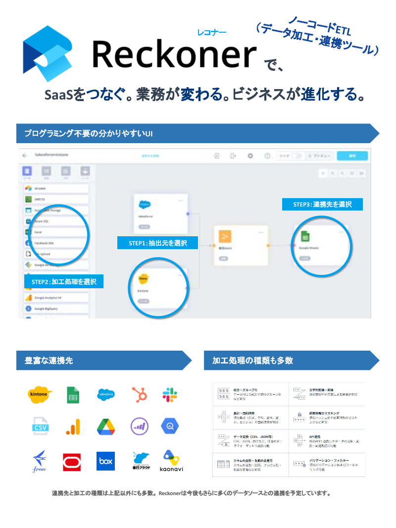Reckonerは使いやすさを重視した、ノーコード型ETL、データパイプライン(データ連携)サービスです。SaaS間のデータ連携を通じてDXを促進し、従来の「仕様策定(プログラム設計)→ 実装 → テスト → 基盤構築 → 運用」といった煩雑な構築プロセスを簡略化します。デ...