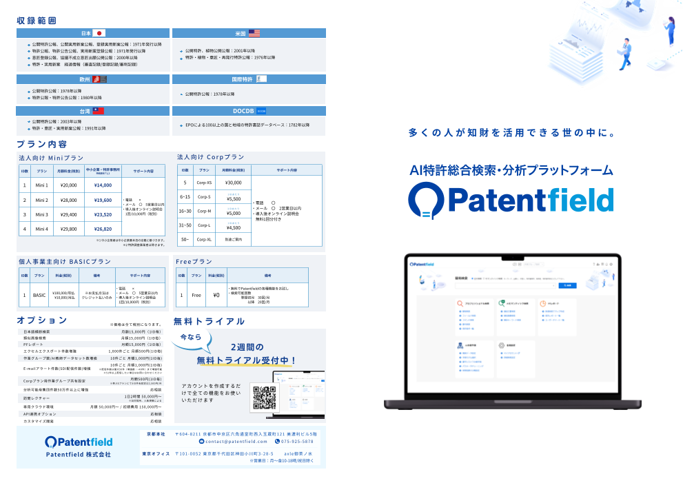 Patentfieldは、特許検索・分析を行う上で便利な、プロフェッショナル検索、 データ可視化、AI調査機能を組み合わせて総合的にご利用できるAI特許総合検索・分析プラットフォームです。AIを駆使したきめ細やかな機能により、特許調査・分析業務が初めての方でも操...