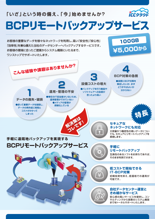 BCPリモートバックアップサービスは、お客様の重要なデータを、さまざまなネットワークを介して、高い「安全性」「安心性」「効率性」を兼ね備えたデータセンターへバックアップするクラウドサービスです。このサービスは、高い機密性を求められるお客様に好評い...