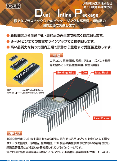 様々なプラスチックのDIPのパッケージングを高品質・短納期の国内工場で製造します。生産中止・集約されたDIP品のパッケージングが可能です。