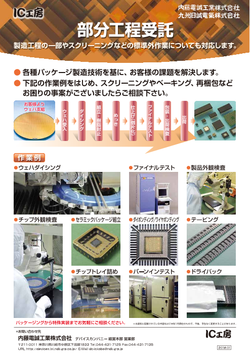 ・ お客様よりウエハーを支給して頂き、ウエハーダイシングから組立、テスティング・梱包までの半導体の後工程を一貫して行います。・試作から小ロット品、量産までの柔軟に対...