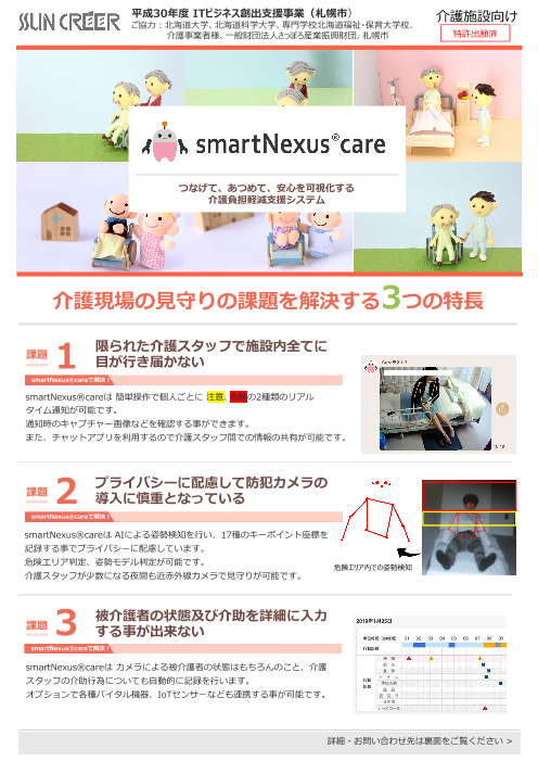 AIによる介護負担軽減を実現将来的な介護スタッフ不足をAIによって負荷軽減を実現するサービスです。被介護者の状態、介護スタッフの介助種別を記録し、危険があれば介護ス...