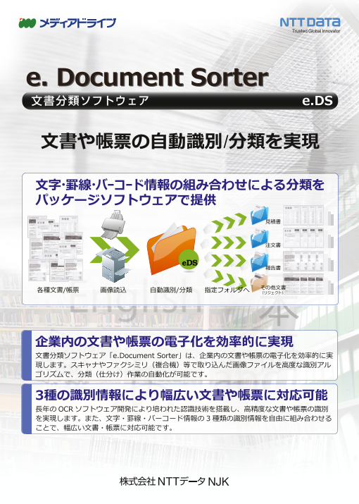 e.Document Sorterは、多種多様なドキュメント(文書・帳票など)の効率的な文書分類・仕分けをRPAとして実現します。スキャナやFAX(複合機)などでスキャンされた入力画像とモデル登録された文書や帳票のレイアウト(罫線、文字、バーコード情報)を照合し、その結果...