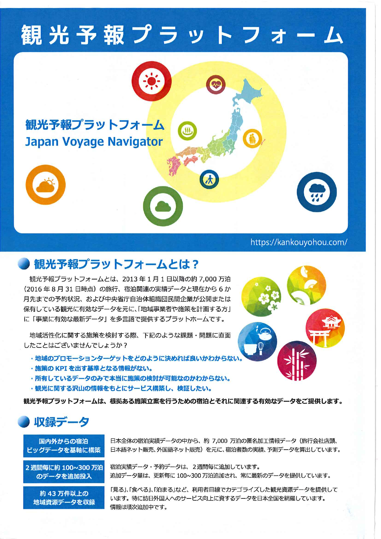 観光予報プラットフォームとは、2013年1月1日以降の約7,000万泊(2016年8月31日時点)の旅行、宿泊関連の実績データと現在から6か月先までの予約状況、および中央省庁自治体組織...