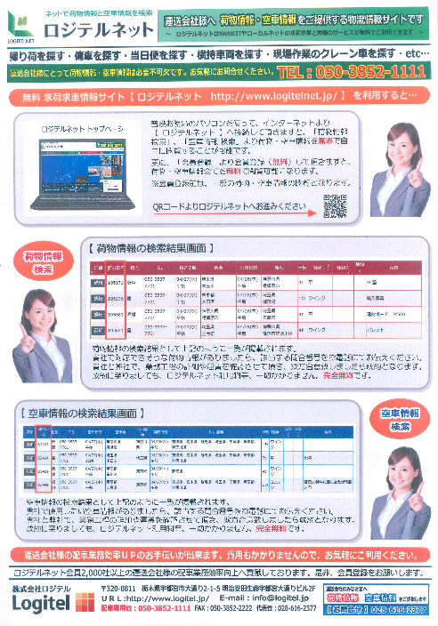 普段お使いのパソコンを使って、インターネットより【ロジテルネット】へ接続して頂きますと、「荷物情報検索」、「空車情報検索」より荷物・空車情報を無料で侍従に閲覧するこ...