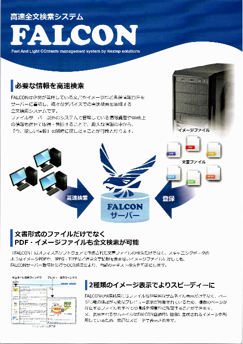 FALCONは企業が管理している文書やイメージなど各種情報資産をサーバーに蓄積し、様々なデバイスでの高速検索を実現する全文検索システムです。ファイルサーバー以外のシステム...