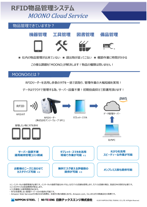 MOONOとは?RFIDリーダーを活⽤し多数のタグを⼀括で読取り、管理作業の⼤幅短縮を実現︕データはクラウドで管理する為、サーバー設置不要︕初期投資抑えて即運⽤頂けます!...