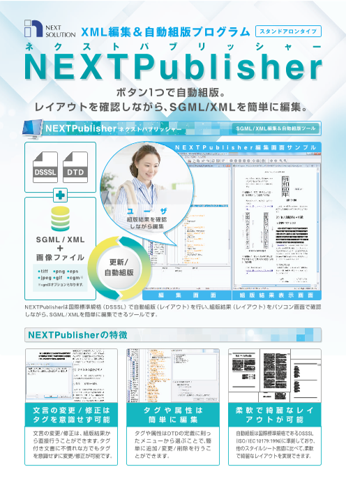 「NEXTPublisher」は技術マニュアル、公文書などのXML/SGMLからボタン1つで国際標準規格に準拠した自動組版を行い、組版結果(レイアウト)を画面で確認しながら、XML/SGML...