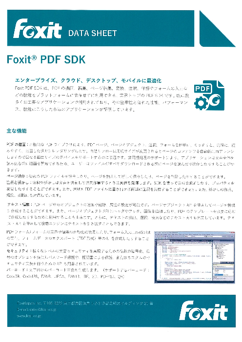 Foxit PDF SDKは、PDFの描画、編集、ページ編集、変換、注釈、保護やフォームの入力などの機能をプラットフォームに依存せずに利用できる、業界トップのPDFSDKです。既に数多く...
