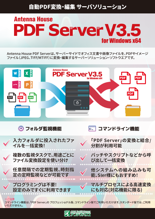 『PDF Server』 はサーバーOSで動作するファイル変換・編集サーバーソリューションソフトウェアです。オフィス文書や画像ファイルなどを、あらかじめ設定した変換設定を利用して自動でPDF等に変換/出力します。また、OCR処理による透明テキスト付きPDF(サーチャブ...