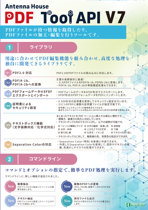 Antenna House PDF Tool API(PDF Tool API)は、PDFファイルの編集処理や、PDFファイルからの情報取得処理を支援するソフトウェアです。PDFファイルの結合、ページ抽出、セキュ...