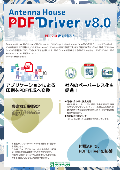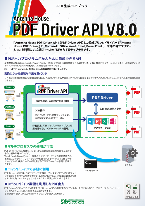 『Antenna House PDF Driver API V8.0』(『PDF Driver API』)は、仮想プリンタドライバー『Antenna House PDF Driver V8.0』と、Microsoft Office Word、Excel、PowerPoint、...