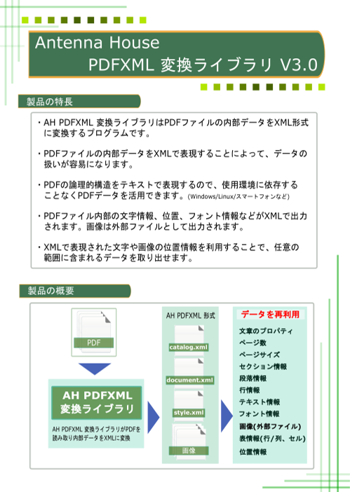PDFXML 変換ライブラリ V3.0(以下、本ライブラリ)は、 PDFファイルを読み込み、内部のテキスト、テーブル、図、画像などをXML形式に変換するプログラムです。 XMLへは文字情報...