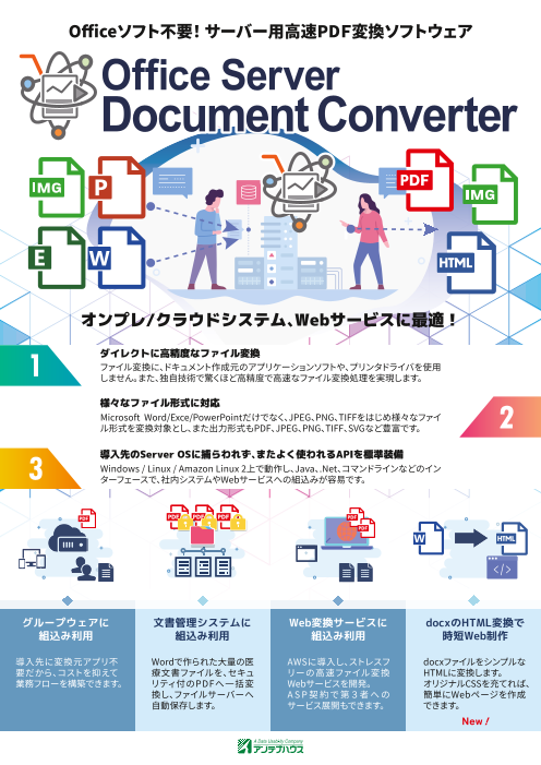 Microsoft Word/Excel/PowerPoint、及びRTF文書をサーバーサイドでPDF /SVG/TIFF/JPEG/PNG/TIFF/INX/XPSファイルへ変換するライブラリです。グループウェアやWebメールシステム...