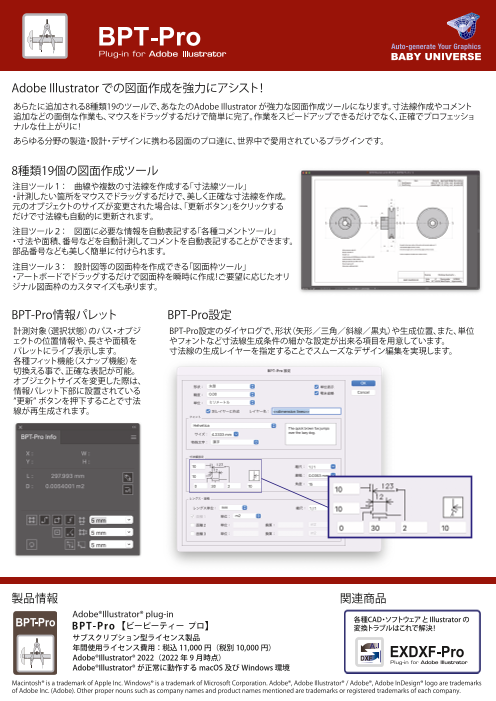あらたに追加される8種類19のツールで、あなたのAdobe Illustrator が強力な図面作成ツールになります。寸法線作成やコメント追加などの面倒な作業も、マウスをドラッグするだけ...