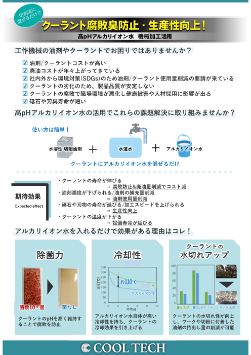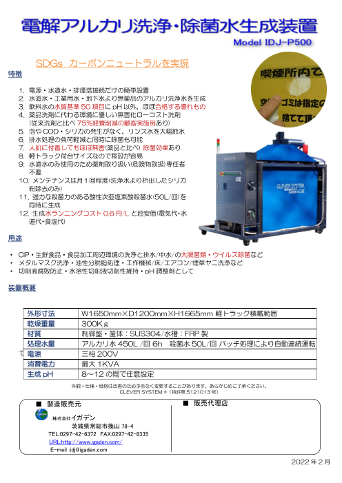 1. 電源・水道水・排煙塔接続だけの簡単設置2. 水道水・工業用水・地下水より無薬品のアルカリ洗浄水を生成3. 飲料水の水質基準50 項目にpH 以外、ほぼ合格する優れもの4....