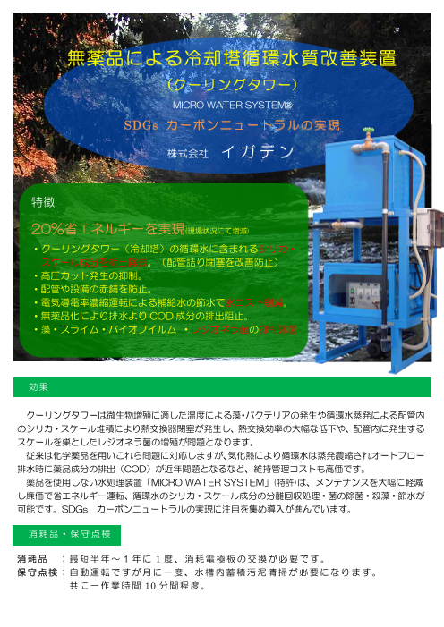 20%省エネルギーを実現(現場状況にて増減)・クーリングタワー(冷却塔)の循環水に含まれるシリカ・スケール成分を析出除去。 (配管詰り閉塞を改善防止)・高圧カット発...