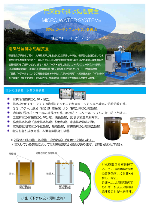 電気分解排水処理装置環境汚染が深刻化する中、地球環境保全を重視し自然環境との共生,循環型社会を目指した水質浄化技術が望まれており、薬品を使用しない電気物理化学的反...