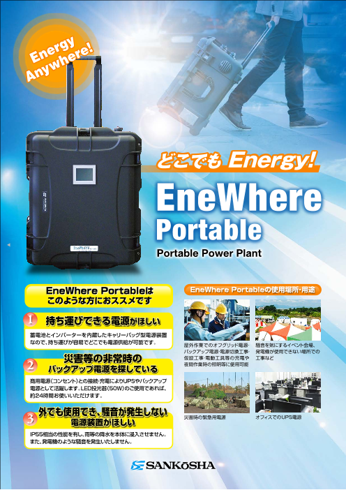 EneWhere Portableはこのような方におススメです。①持ち運びできる電源がほしい蓄電池とインバーターを内蔵したキャリーバッグ型電源装置なので、持ち運びが容易でどこで...