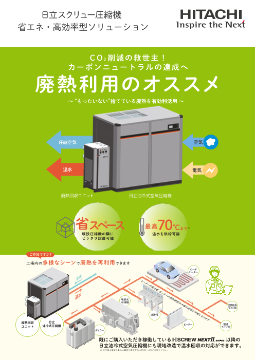 ~ “もったいない”捨てている廃熱を有効利活用 ~◆省スペース既設圧縮機の隣にビッタリ設置可能◆最大70℃まで温水を供給可能◆詳細はカタログをダウンロードしご覧い...