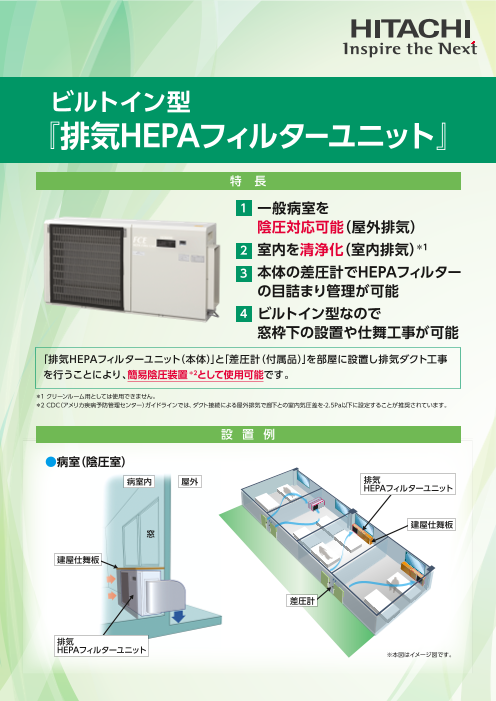 ◆室内を清浄化(室内排気)*1◆「排気HEPAフィルターユニット(本体)」と「差圧計(付属品)」を部屋に設置し排気ダクト工事を行うことにより、簡易陰圧装置*2として使用可能です。...